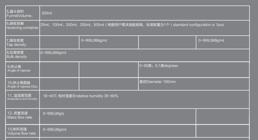 提供中文或英文語言版本選擇,,自動(dòng)測量控制系統(tǒng),分析粉末和顆粒物料,采用光電測量系統(tǒng)自動(dòng)測量數(shù)據(jù),數(shù)據(jù)由集成電路系統(tǒng)處理并分析評(píng)定物料的流動(dòng)性狀態(tài),反映粉體和顆粒的流動(dòng)能力和密度數(shù)據(jù)為料倉設(shè)計(jì)。